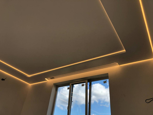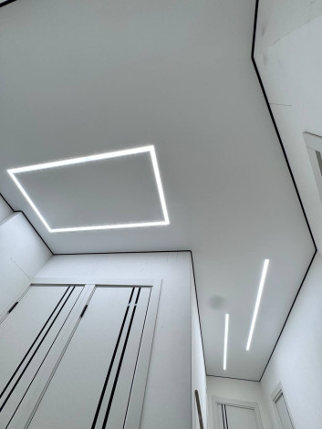Со скрытой подсветкой по периметру: контурными потолками, с нишами SLOTT, спотами на треке, точечными и накладными светильниками, светопрозрачными покрытиями и световыми линиями, световые натяжные потолки;